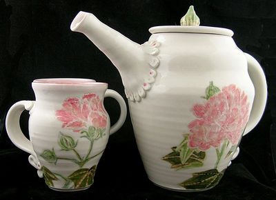 The process known as “raku” was first developed in Japan in the 16th century. I use relatively low-fire clay and I mix my own glazes from raw materials. After forming the clay and decorating it, it is bisque-fired in an electric kiln at about 900 degrees C. I then glaze the pieces and do a raku-fire in my Clay-Dog Raku kiln. I chose to buy this small kiln so I can lift the chamber by myself. Once fired, raku ware is not functional for food, drink or holding liquid due to its porous nature. Because of this, I’ve chosen to use the raku process to make work that can be used safely in different ways: e.g. salt and pepper shakers, mirror frames and soap dishes.