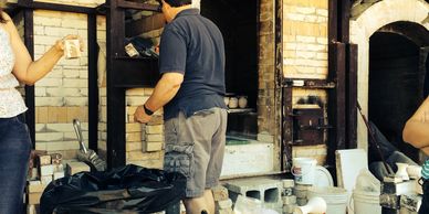 The kiln is loaded by a group of experienced potters and students, using “wads” to stilt the pots and ceramic sculptures. This wadding will prevent the bottoms of the work from fusing to the kilnshelves, and will allow the flame to flow under the pot as well.